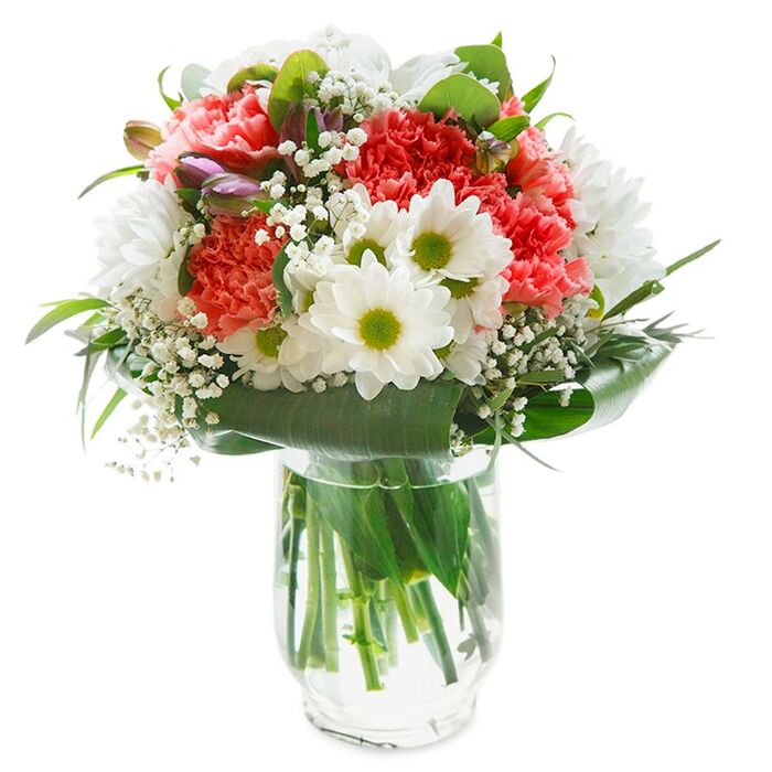 Experience the beauty and uniqueness of our meticulously crafted flower arrangement. This stunning bouquet features a soft color palette with snow-white chrysanthemums, delicate gypsophila, and light pink carnations, all artfully arranged with aspidistra leaves.